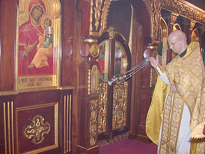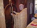 | Following the prothesis the priest (or deacon) incenses the altar, the icons, and the entire church. |